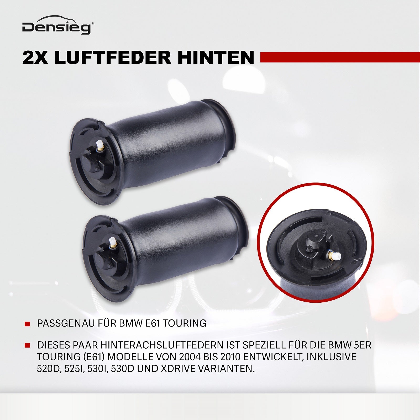 1) Passgenau für BMW E61 Touring: Dieses Paar Hinterachsluftfedern ist speziell für die BMW 5er Touring (E61) Modelle von 2004 bis 2010 entwickelt, inklusive 520d, 525i, 530i, 530d und xDrive Varianten.