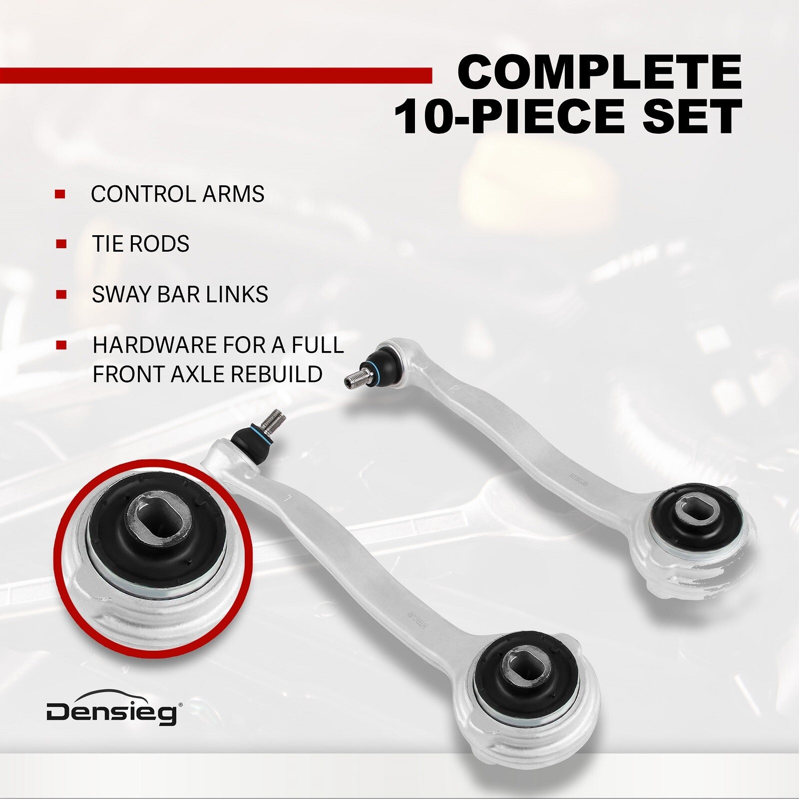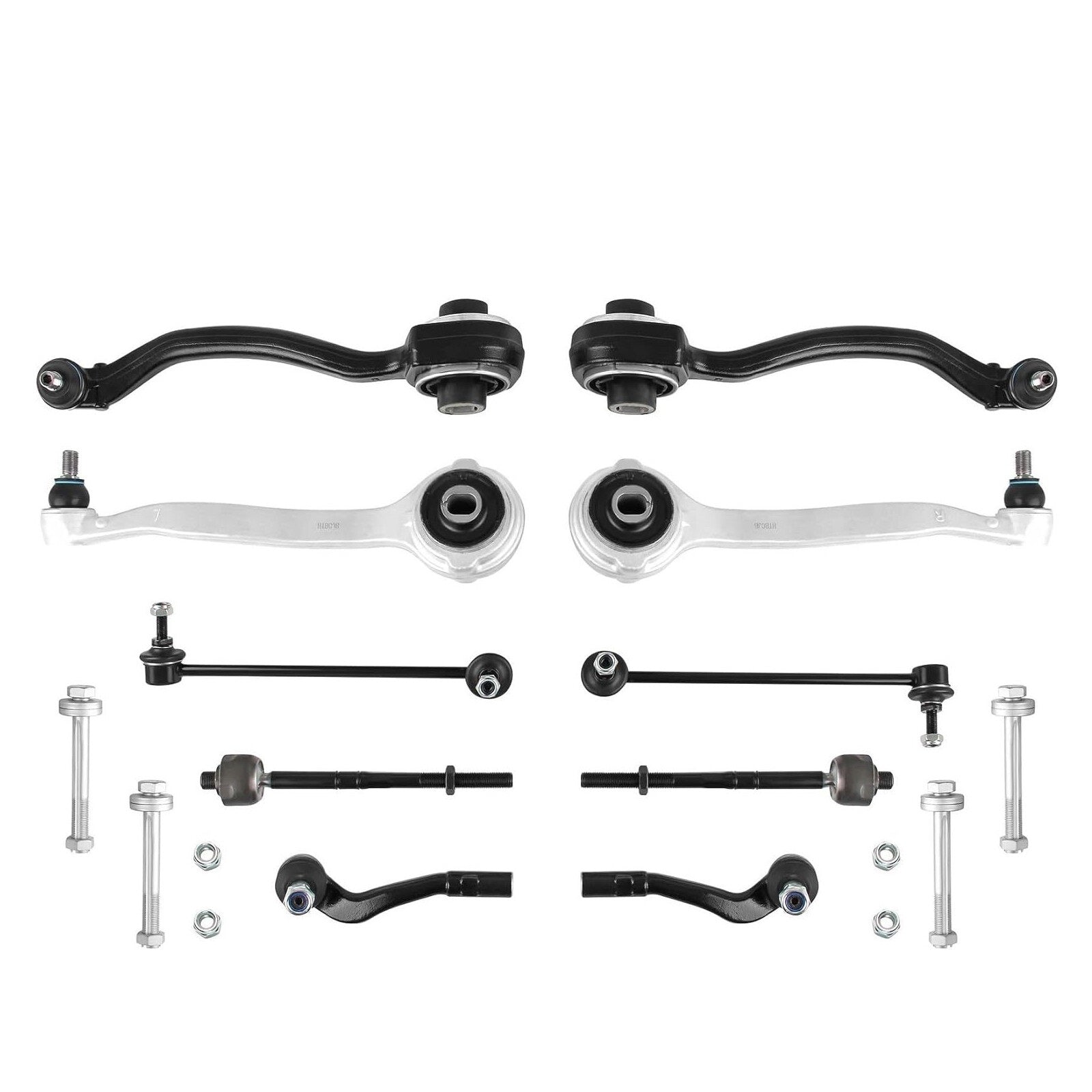 1) Komplettes 10-teiliges Set - Enthält Querlenker (control arms), Spurstangen (tie rods), Stabilisatorlenker (sway bar links) und Montagematerial für den vollständigen Wiederaufbau der Vorderachse.