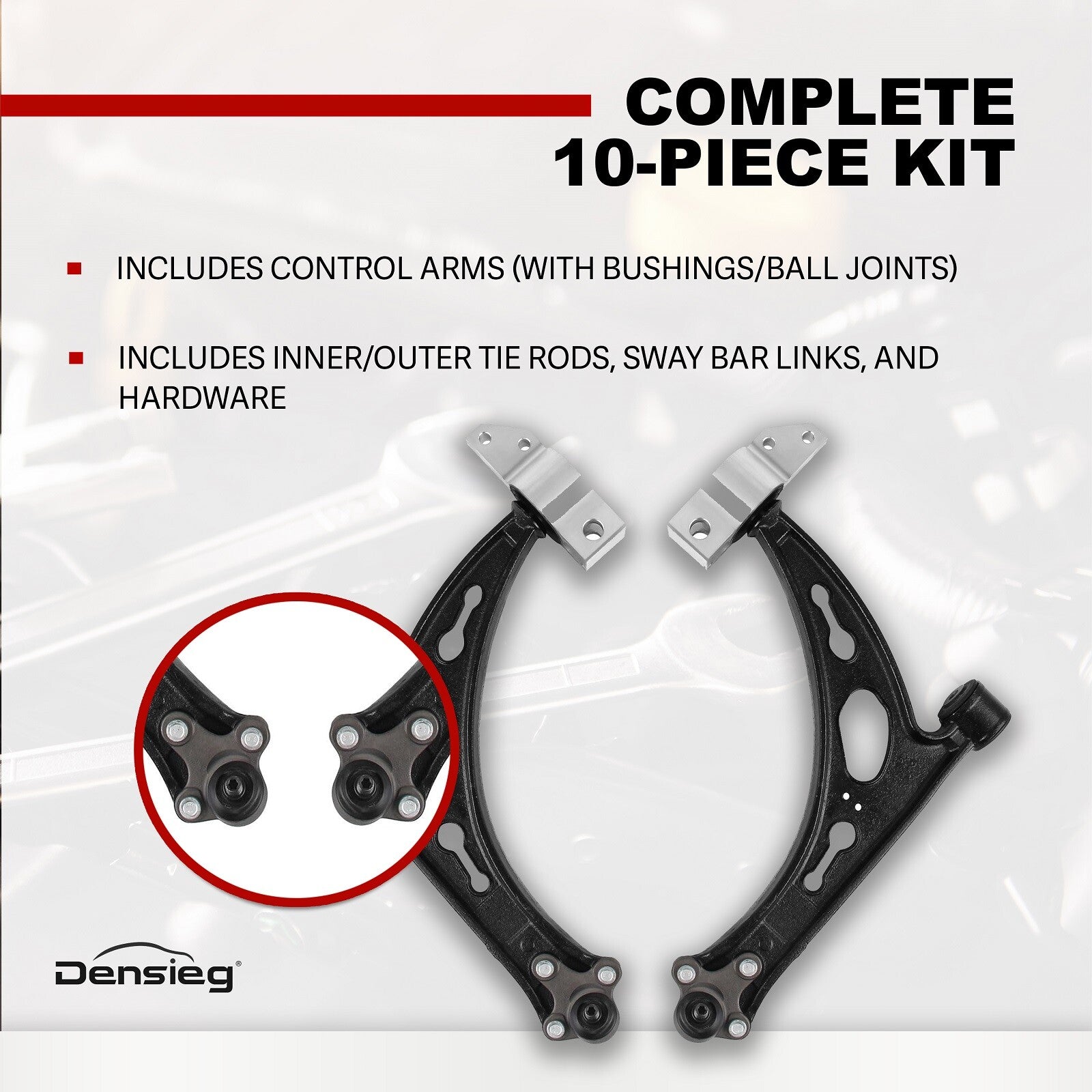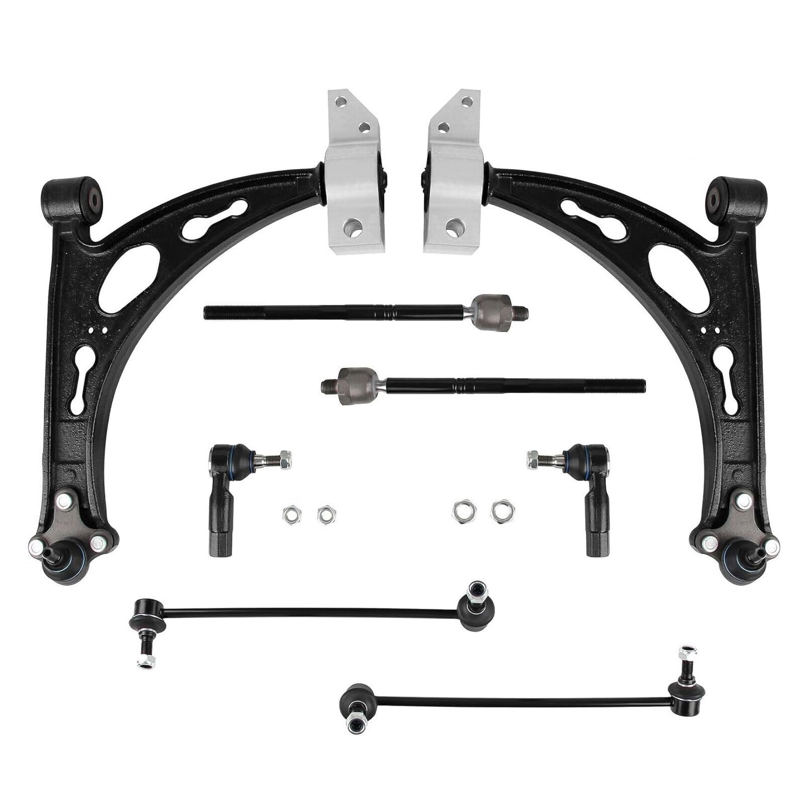 1) Kompletter 10-teiliger Satz - Beinhaltet Querlenker (mit Buchsen/Kugelgelenken), innere/äußere Spurstangen, Stabilisatoranbindungen und Hardware.