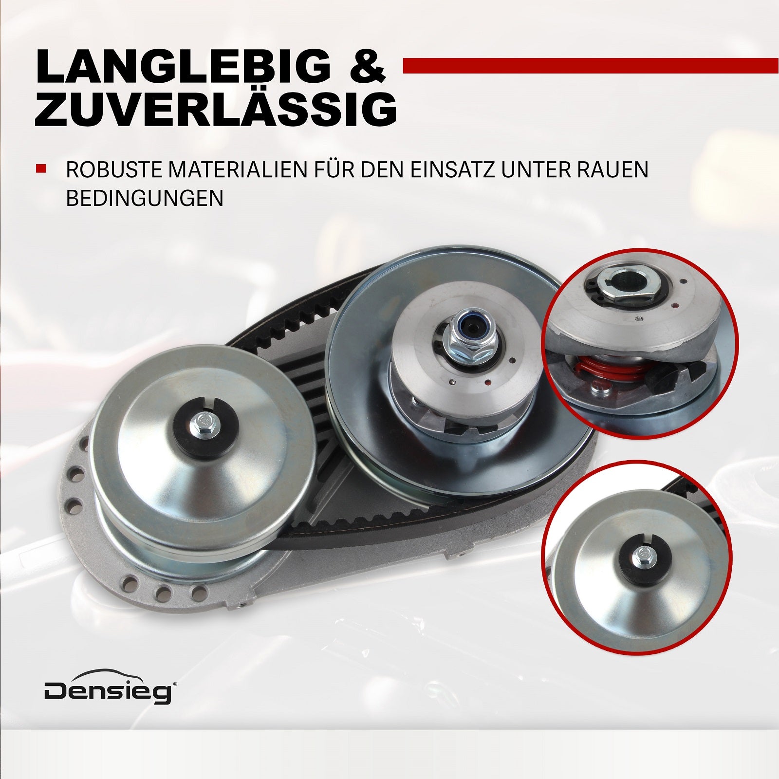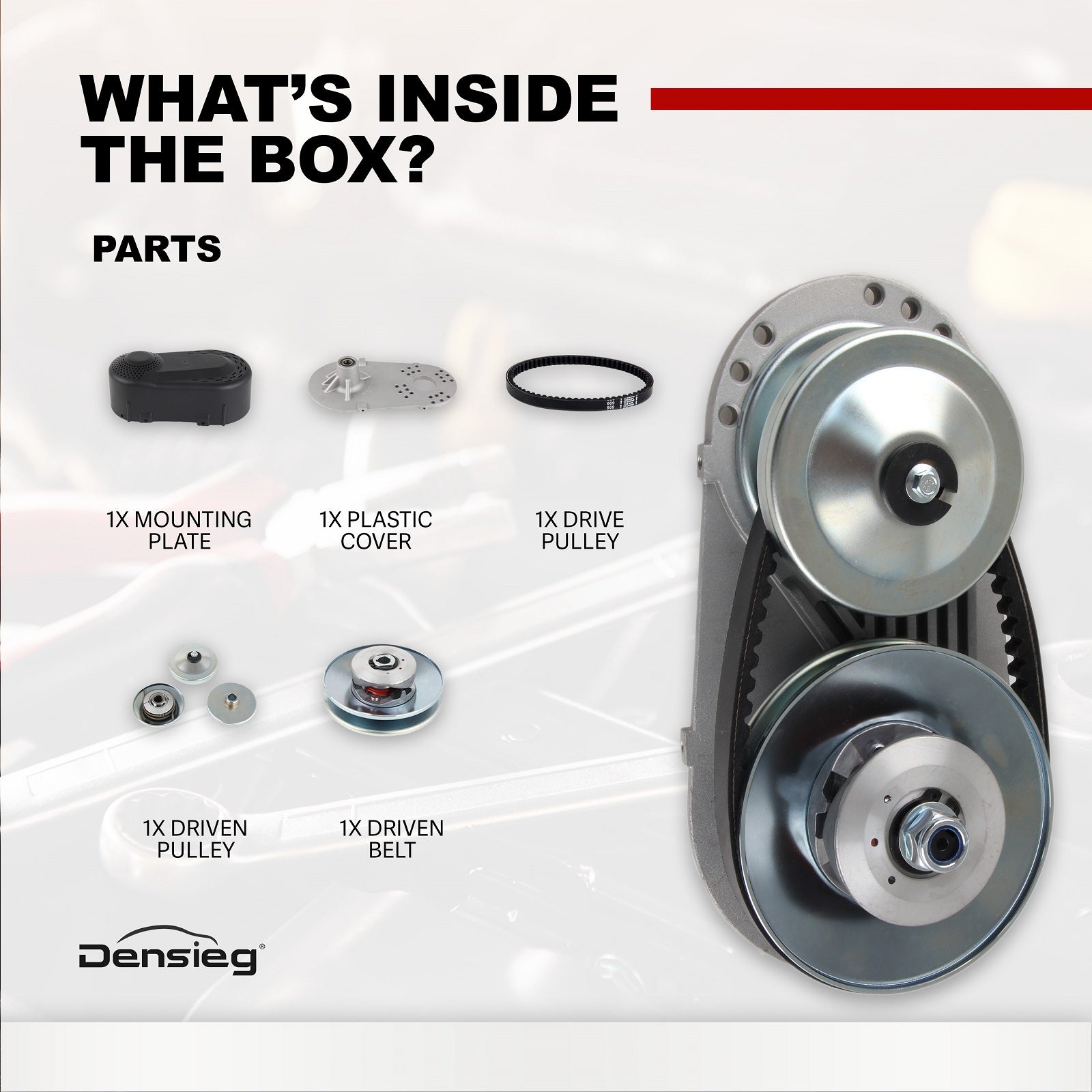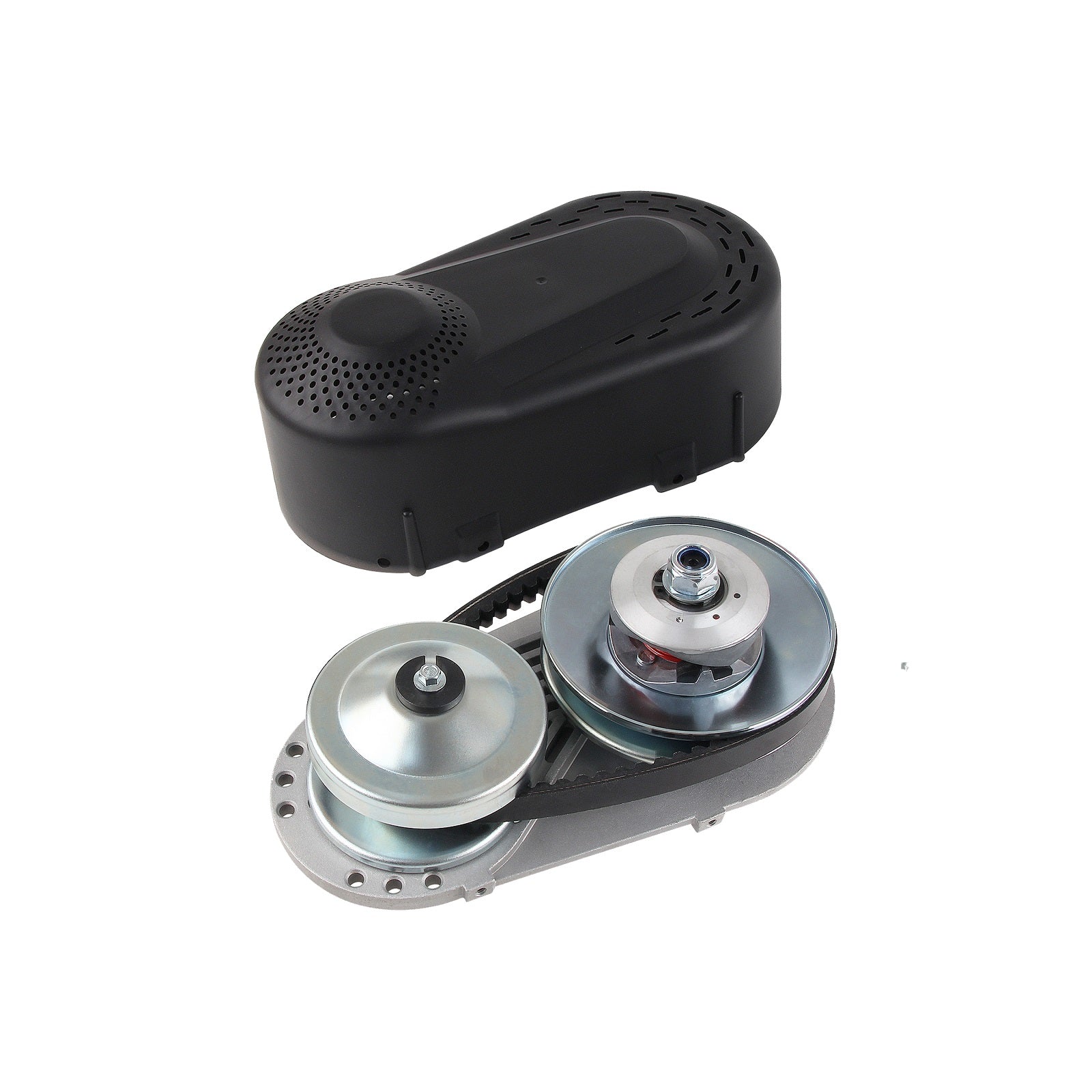 4) Komplettes Montageset – Inkl. Riemen, Antriebs- und Abtriebsriemenscheibe, Montageplatte, Schutzabdeckung und Befestigungsteilen.