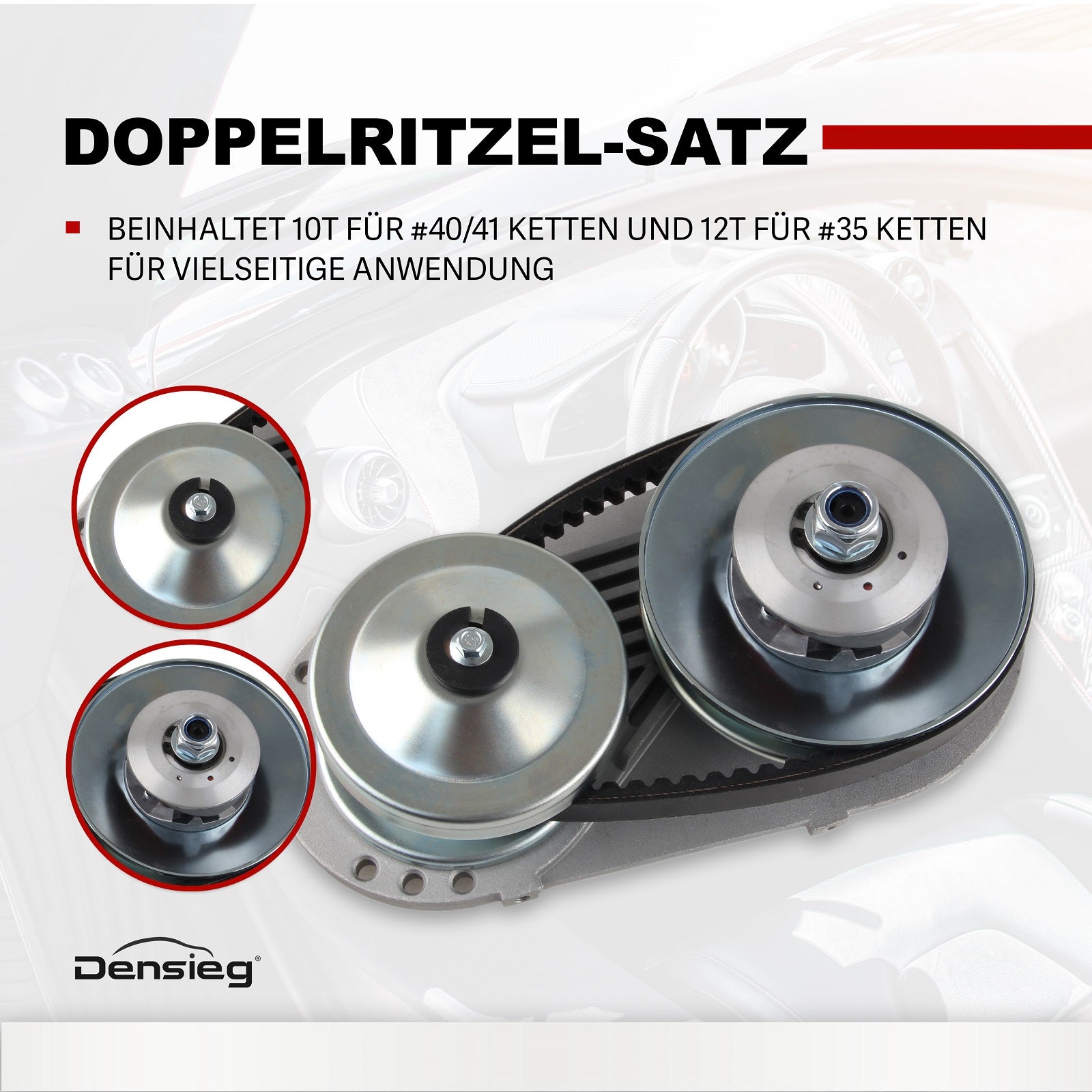 2) Doppelritzel-Satz – Beinhaltet 10T für #40/41 Ketten und 12T für #35 Ketten für vielseitige Anwendung.